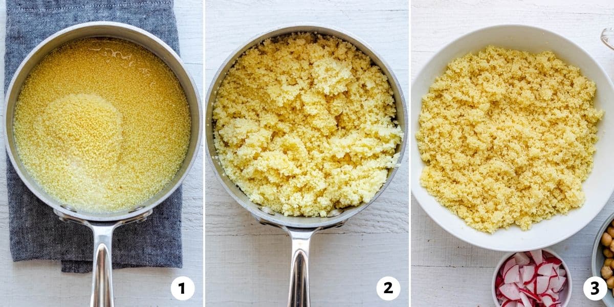 Largo tenxheren prej zjarrit dhe leje me pushu kuskusin rreth pesë minuta; deri sa të i shteret uji. Me lugë druri ose pirun përzieje ngapak kuskusin dhe leje me u ftoftë për 10 minuta.