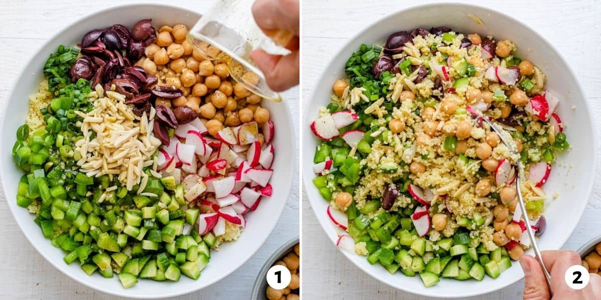Shtoji masës kripë dhe biber sipas dëshirës. Perimet bashkë me kuskusin vendosi në një enë të thellë. Shto përbërësit kryesor dhe përzije sallatën mirë.