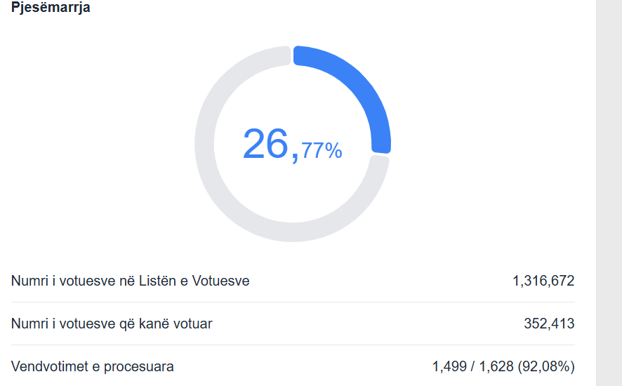 Sipas njoftimit të KQZ-së, deri në orën 17:00 nga 1,316,672 qytetarë të regjistruar në Listën e Votuesve, kanë votuar 352,413 persona, që përbën një pjesëmarrje prej 26.77%.