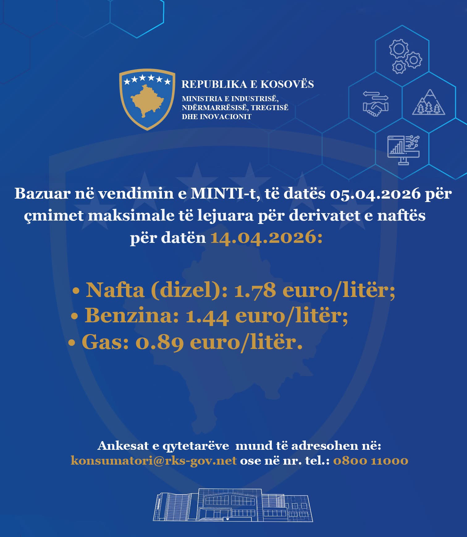 Sipas njoftimit të Ministrisë së Industrisë, Ndërmarrësisë, Tregtisë dhe Inovacionit, nga e marta (14 prill), një litër naftë mund të shitet deri në 1.78 euro, nga 1.84 euro sa ishte një ditë më parë.