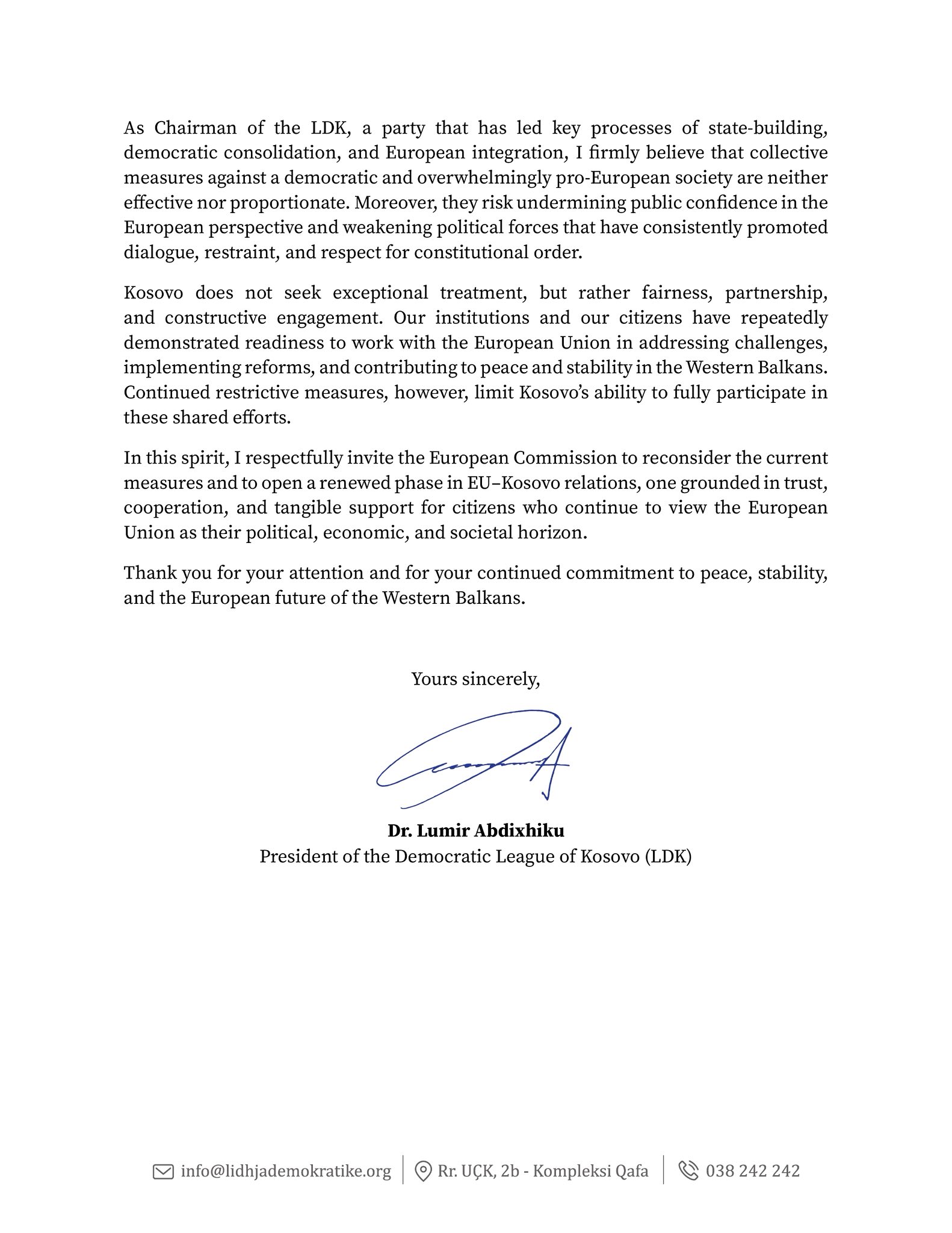 Kreu i Lidhjes Demokratike të Kosovës dhe kandidati për kryeministër, Lumir Abdixhiku, i ka dërguar një letër presidentes së Komisionit Evropian, Ursula von der Leyen, duke kërkuar heqjen e menjëhershme të masave ndëshkuese të Bashkimit Evropian ndaj Kosovës.