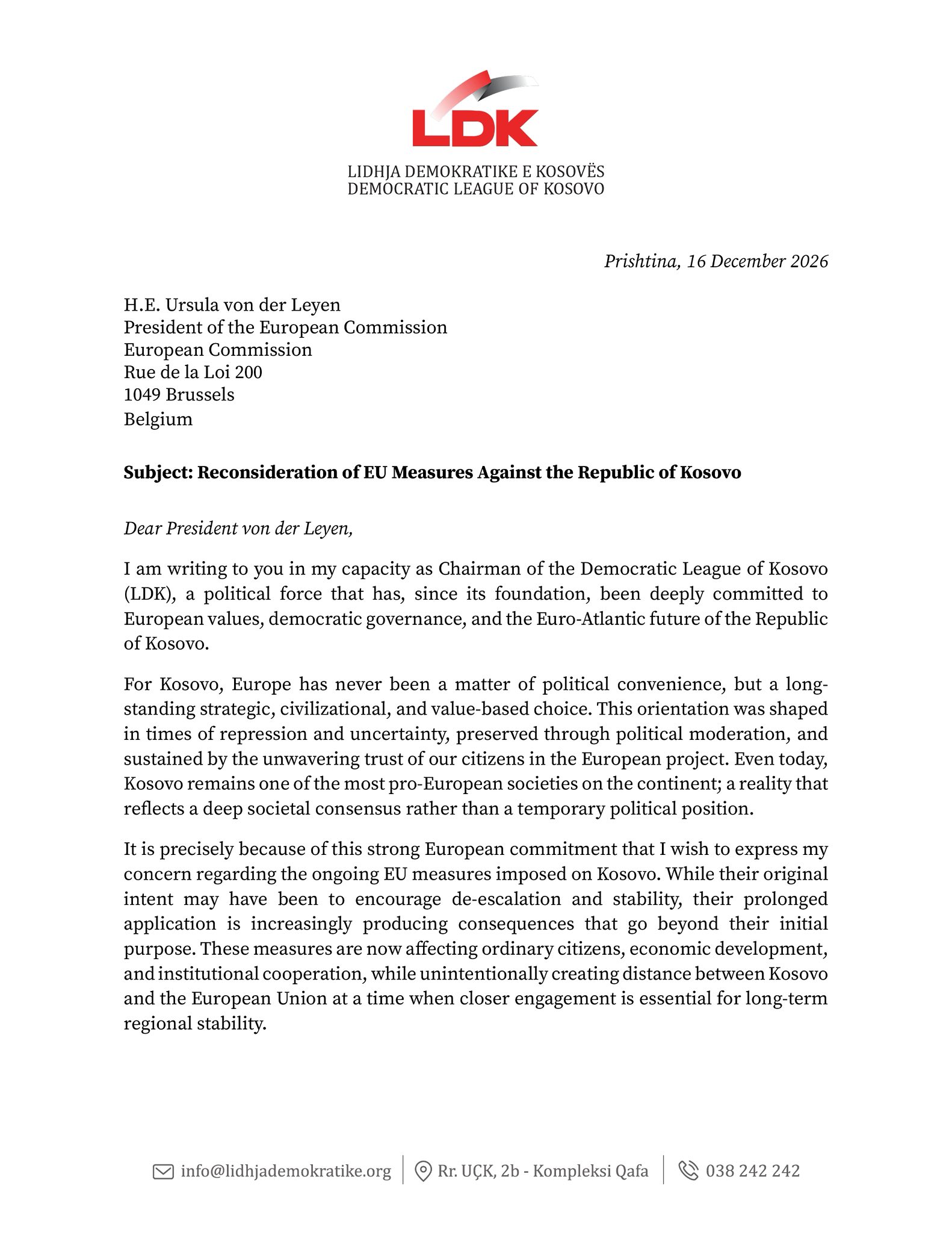 Kreu i Lidhjes Demokratike të Kosovës dhe kandidati për kryeministër, Lumir Abdixhiku, i ka dërguar një letër presidentes së Komisionit Evropian, Ursula von der Leyen, duke kërkuar heqjen e menjëhershme të masave ndëshkuese të Bashkimit Evropian ndaj Kosovës.
