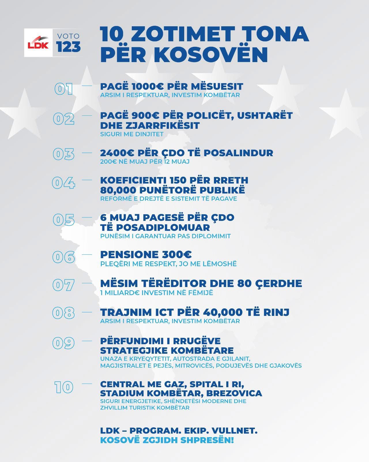 Kryetari dhe kandidati i Lidhjes Demokratike të Kosovës, Lumir Abdixhiku, ka publikuar 10 zotimet e partisë së tij për katër vitet e ardhshme.