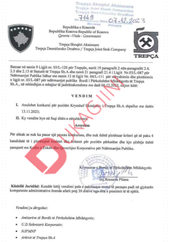 “Për shkak se nuk ka pasur një proces konkurrues, dhe nuk është plotësuar kriteri që së paku 4 kandidatë të i plotësojnë kushtet dhe kriteret për pozitën përkatëse dhe kjo çështje është paraparë me Kodin e Etikës dhe Qeverisë Korporative për Ndërmarrje Publike”, thuhet në vendim që posedon Dukagjini.