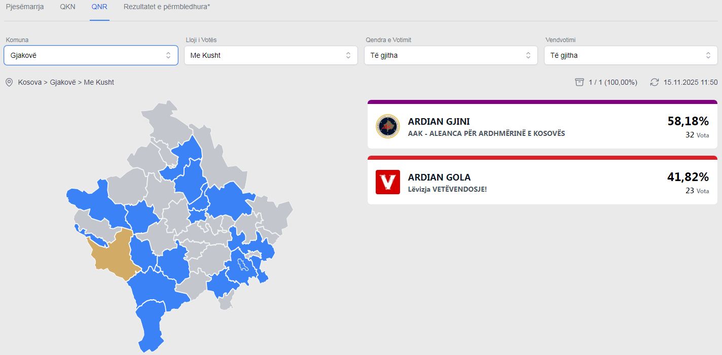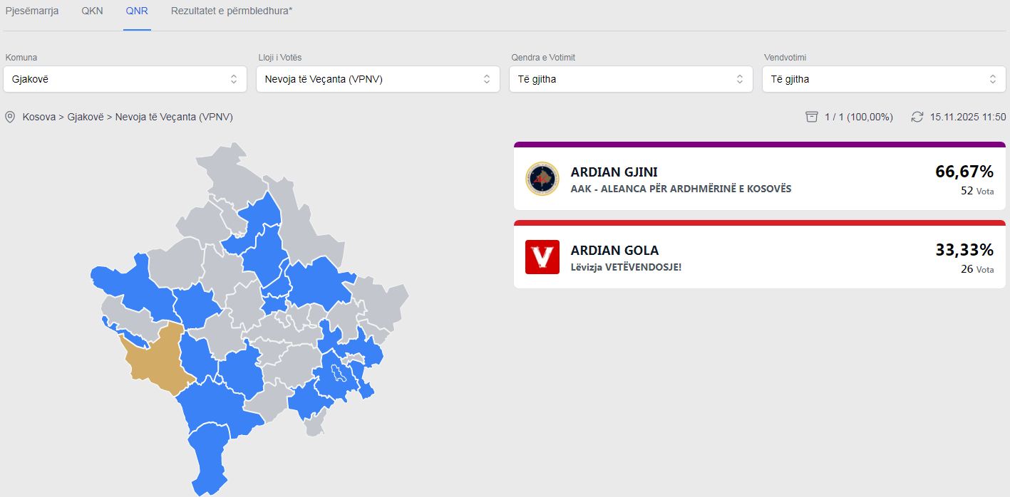 Kryetari i Gjakovës nga Aleanca për Ardhmërinë e Kosovës, Ardian Gjini, prin në votat me kusht dhe ato të nevojave të veçanta në raundin e dytë të zgjedhjeve lokale.