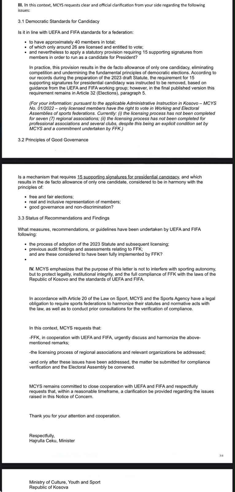 Ministria e Kulturës, Rinisë dhe Sportit (MKRS) i është drejtuar zyrtarisht UEFA-s dhe FIFA-s, duke kërkuar sqarim urgjent lidhur me procesin zgjedhor në Federatën e Futbollit të Kosovës (FFK), harmonizimin e Statutit dhe respektimin e standardeve të qeverisjes së mirë.