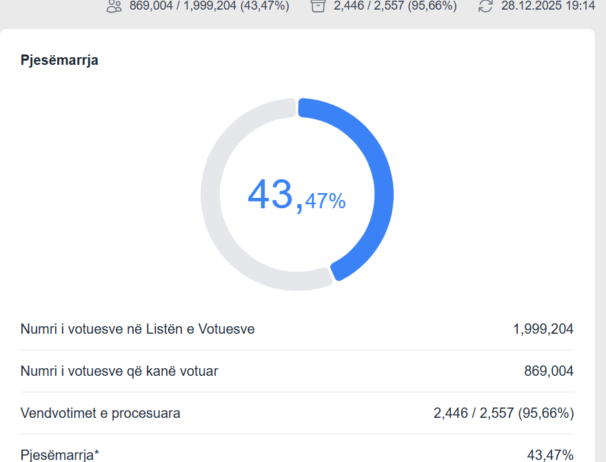 Komisioni Qendror i Zgjedhjeve (KQZ) njofton se deri në përfundimin e periudhës së lejuar për hyrje në qendrat e votimit, ora 19:00, kanë votuar 869,004 qytetarë, ose 43,47% e votuesve me të drejtë vote.