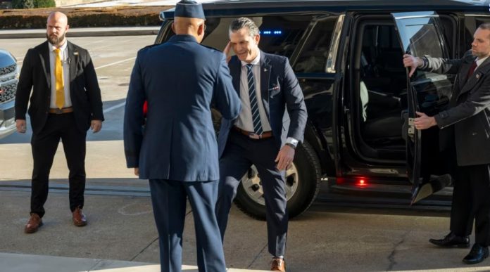Zoti Hegseth u përshëndet në hyrje të godinës (Pentagonit) nga ushtaraku më i lartë, Shefi i Shefave të Shtabit të Bashkuar, gjenerali i Forcave Ajrore C.Q. Brown, të cilin sekretari i mbrotjes e ka kritikuar në një nga librat e tij të fundit.