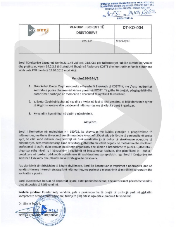 Vendimi për shkarkimin e Evetar Zeqirit është nënshkruar nga Kryesuesi i Bordit të Drejtorëve në KOSTT, Gëzim Tosuni.