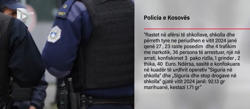“Rastet në afërsi të shkollave, shkolla dhe përreth tyre ne periudhen e vitit 2024 janë qenë 27 , 23 raste posedim dhe 4 trafikim me narkotik, 36 persona të arrestuar, një në arrati, konfiskimet 3 pako rizlla, 1 grinder , 2 thika, 40 Euro. Ndërsa, sasitë e konfiskuara në kuadër të urdhrit operativ “Siguria në shkolla” dhe ,,Siguria dhe stop drogave në shkolla” gjatë vitit 2024 janë: 92.13 gr marihuanë, kestazi 1.71 gr”=Policia e Kosovës.
