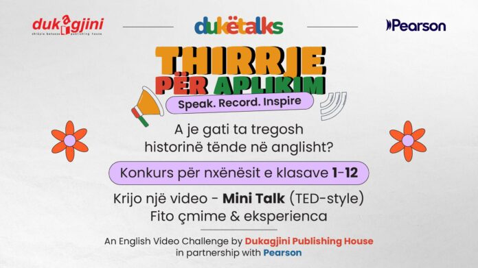 Shtëpia botuese Dukagjini, në bashkëpunim me Pearson, ka hapur thirrjen për aplikim në konkursin “DUKË TALKS – Speak. Record. Inspire”, një iniciativë që synon të nxisë kreativitetin dhe aftësitë komunikuese në gjuhën angleze te nxënësit në të gjithë Kosovën.