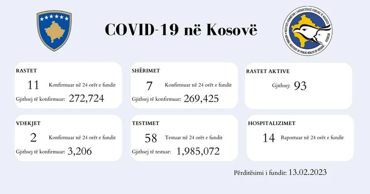 Instituti Kombëtar i Shëndetësisë Publike (IKSHPK) ka bërë të ditur se gjatë 24 orëve të fundit, në Kosovë janë regjistruar dy vdekje dhe 11 raste pozitive me Covid-19