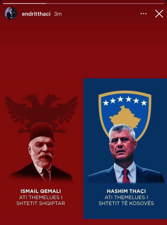 Përmes një storie në rrjetet sociale, ai ka publikuar një imazh ku shfaqen krah për krah dy figura historike: Ismail Qemali, i Ati themelues i shtetit shqiptar, dhe Hashim Thaçi, të cilin ai e cilëson si atin themelues të shtetit të Kosovës.