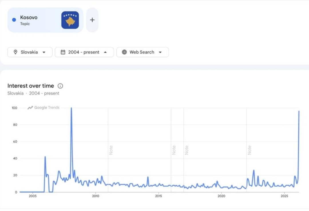 Fitorja e Kosovës në Bratislavë ka tërhequr vëmendje të madhe ndërkombëtare, duke e kthyer vendin në një nga temat kryesore në Sllovaki, sipas të dhënave të Google Trends.