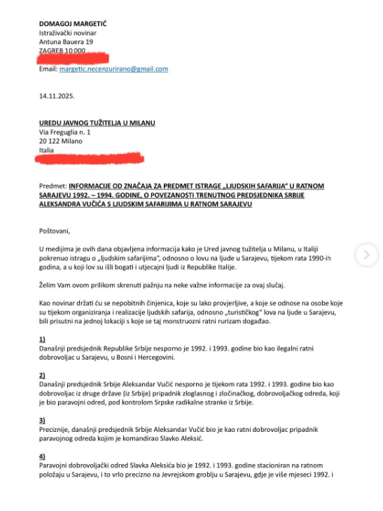 Gazetari hulumtues kroat, Domagoj Margetiq, ka dorëzuar një kallëzim në Zyrën e Prokurorit Publik në Milano lidhur me “Sarajevo Safarin” duke kërkuar nisjen e hetimeve për akuzat se të huajt paguanin për të qëlluar mbi civilët gjatë rrethimit të Sarajevës, para tri dekadash.
