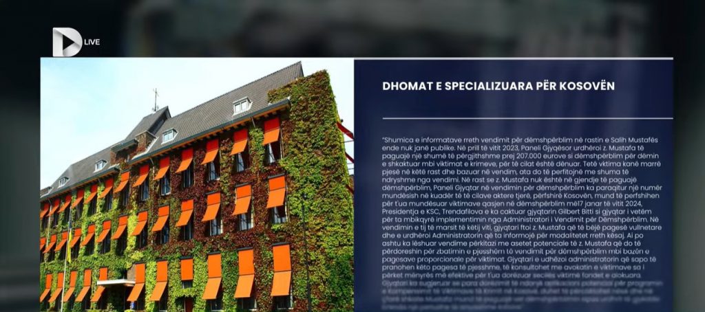 “Shumica e informatave rreth vendimit për dëmshpërblim në rastin e Salih Mustafës ende nuk janë publike. Në prill të vitit 2023, Paneli Gjyqësor urdhëroi z. Mustafa të paguajë një shumë të përgjithshme prej 207.000 eurove si dëmshpërblim për dëmin e shkaktuar mbi viktimat e krimeve, për të cilat është dënuar. Tetë vktima kanë marrë pjesë në këtë rast dhe bazuar në vendim, ata do të perfitojnë me shuma të ndryshme nga vendimi. Në rast se z. Mustafa nuk është në gjendje të paguajë dëmshpërblim, Paneli Gjyqtar në vendimin për dëmshpërblim ka paraqitur një numër mundësish në kuadër të të cilave aktere tjerë, përfshirë Kosovën, mund të perfshihen për t’ua mundësuar viktimave qasjen në dëmshpërblim më17 janar të vitit 2024, Presidentja e KSC, Trendafilova e ka caktuar gjyqtarin Gilbert Bitti si gjyqtar i vetëm për ta mbikqyrë implementimin nga Administratori i Vendimit për Dëmshpërblim. Në vendimin e tij të marsit të këtij viti, gjyqtari ftoi z. Mustafa që të bëjë pagesë vullnetare dhe e urdhëroi Administratorin që ta informojë për modalitetet rreth kësaj. Ai po ashtu ka lëshuar vendime përkitazi me asetet potenciale të z. Mustafa që do të përdoreshin për zbatimin e pjesshëm të vendimit për dëmshpërblim mbi bazën e pagesave proporcionale për viktimat. Gjyqtari e udhëzoi administratorin që sapo të pranohen këto pagesa të pjesshme, të konsultohet me avokatin e viktimave sa i përket mënyrës më efektive për t’ua dorëzuar secilës viktimë fondet e alokuara. Gjyqtari ka sugjeruar se para dorëzimit të ndonjë aplikacioni potencial për programin e Kompensimit të Viktimave të Krimit në Kosovë, duhet të përcaktohet nëse dhe në çfarë shkalle Mustafa mund të paguajë vet dëmshpërblimin sipas urdhrit të gjykatës brenda një periudhe të arsyeshme kohore.” – Dhomat e Specializuara për Kosovën.