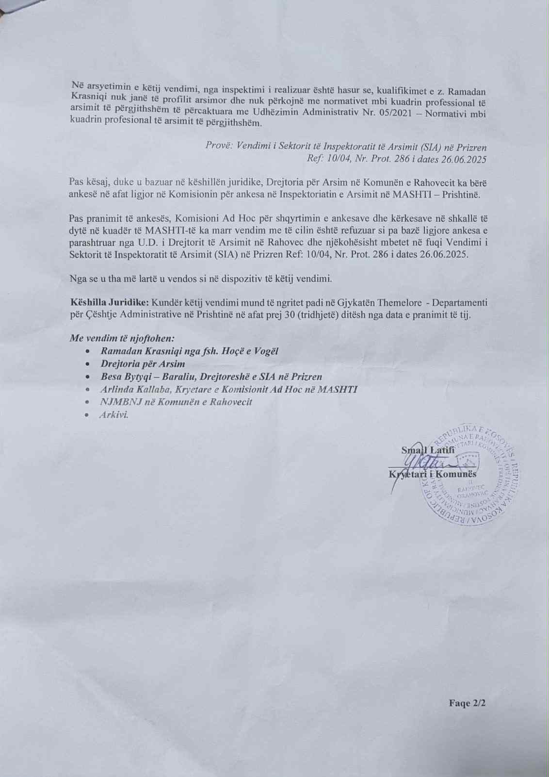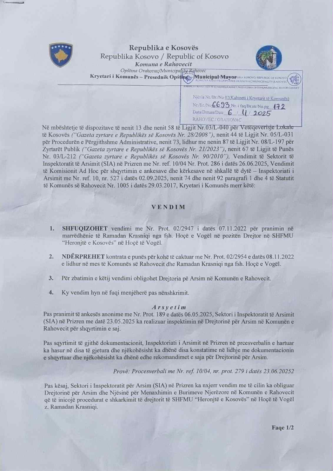 “Puna ime ka qenë transparente dhe nuk ka pasur kurrë ankesë gjatë punës time.. jemi shkollë model në Rahovec. Smajl Latifi nëpërmjet njerëz ve ka kërku nëpërmjet njerëzve që ta mbështesës në fushatë kanë kërku me organizu tubime të veteranëve në kuadër të veteranëve të luftë – gjë që skam pranuar meqë nuk më lejohet ndërsa të drejtën për të qenë anëtarë nuk ma ndalon kërkush – në mënyrë indirekte ka dërgu në vazhdimësi që të inkuadrohem. DKA-ja ma ka informu që janë duke u anku inspektorati pasi janë thirrë në shkeljen në bazë të udhëzimit administrativ. Më duket se po më bëhet padrejtësi… vendimin e kam marrë. Mua më duket hakmarrje politike pasi ky kryetar shantazhon dhe kjo ka bërë që me një vendim të Inspektoratit më ka shkarku.. kam 30 ditë kohë për ankesë, do të ngrehë edhe padi”, u shpreh Krasniqi.