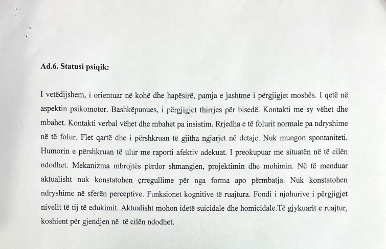 Humorin e përshkruan të ulur me raporti afektiv adekuat. I preokupuar me situatën në të cilën ndodhet. Mekanizma mbrojtës përdor shmangien, projektimin dhe mohimin. Në të menduar aktualisht nuk konstatohen çrregullime për nga forma apo përmbatja. Nuk konstatohen ndryshime në sferën perceptive. Funksionet kognitive të ruajtura. Fondi i njohurive i përgjigjet nivelit të tij të edukimit. Aktualisht mohon idetë suicidale dhe homicidale.Të gjykuarit e ruajtur, koshient për gjendjen në të cilën ndodhet”, thuhet në raport.