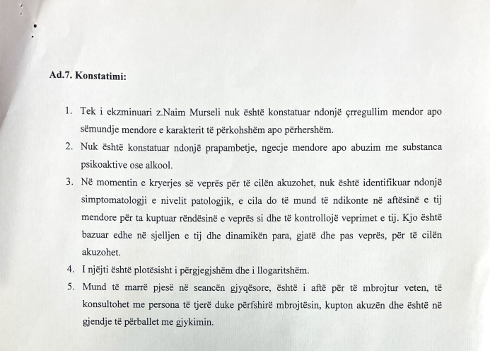 “Tek i ekzminuari z.Naim Murseli nuk është konstatuar ndonjë çrregullim mendor apo sëmundje mendore e karakterit të përkohshëm apo përhershëm.