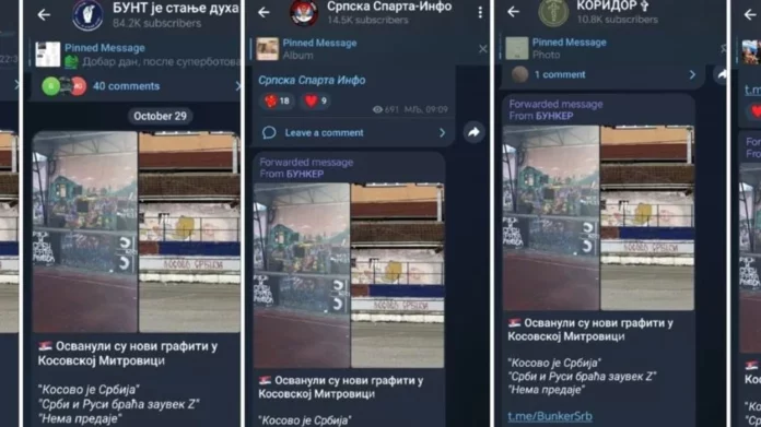 Kështu, më 29 tetor, kanali “Bunker” në Telegram njoftoi se në Mitrovicë të Veriut janë shfaqur grafite të reja: “Kosova është Serbi”, “Serbët dhe rusët janë vëllezër përgjithmonë Z”, “Nuk ka dorëzim”.