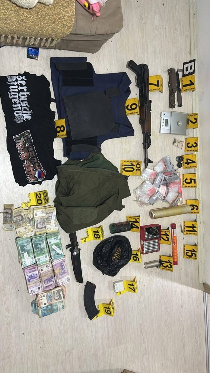 Gjatë kontrollit në banesë, policia ka gjetur edhe thikën që dyshohet se është përdorur në rast, si dhe një sërë armësh, municionesh dhe pajisjesh të tjera, përfshirë një armë automatike AK-47 me municion, një granatë dore, antiplumb, shok-bomba, thika, si dhe pajisje që dyshohet se shërbejnë për përgatitjen dhe paketimin e narkotikëve.
