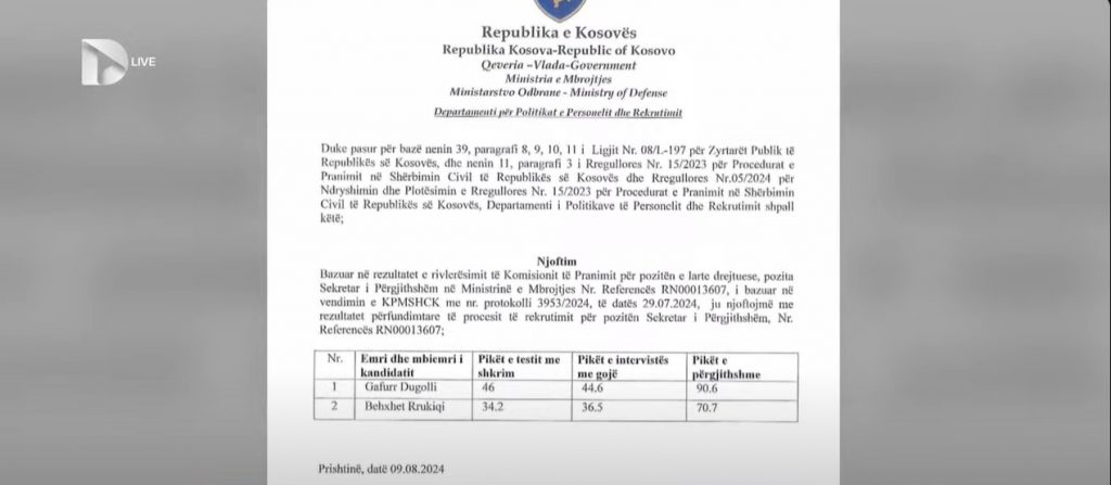 Nuk mjaftuan testimet që fazat rekrutuese për pozitën për sekretar të përgjithshëm në Ministrinë e Mbrojtjes të rezultonin me të paktën dy kandidatë me mbi 70 pikë, njësoj si kishte ndodhur edhe herën e parë kur u mbajt konkursi.