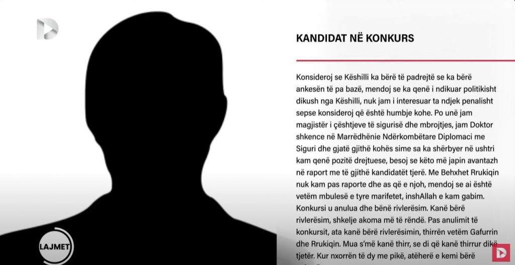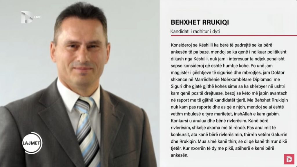 Së pari, nuk jam favorizuar. Nga komisioni intervistues jam eliminuar por kam bërë ankesë në KPShMC dhe ankesa më është aprovuar. Përvoja ime në CV nuk është vlerësuar profesionalisht nga komisioni intervistues. Por, KSHPMC e ka aprovuar ankesën time. Kam mbi gjashtë vite drejtor i AQP-së dhe CV-ja ime dhe përvoja ime nga ai komision të vlerësohej nuk ishte e drejtë. Mbi 15 vite pozitë udhëheqëse në AQP. Po të isha zgjedh unë sekretar, jam i bindur që të paktën procedurat e prokurimit nuk do ishin temë në mediat ditore. Dhe jo, nuk jam thirrë nga askush. – Behxhet Rrukiqi, kandidati i radhitur i dyti