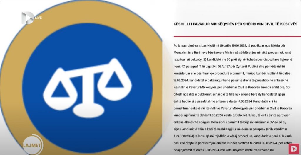 Po ju sqarojmë se sipas Njoftimit të datës 19.06.2024, të publikuar nga Njësia për Menaxhimin e Burimeve Njerëzore e Ministrisë së Mbrojtjes në këtë proces nuk kanë rezultuar së paku dy (2) kandidatë me 70 pikë siç kërkohet sipas dispozitave ligjore të nenit 47, paragrafi 11 të Ligjit Nr. 08/L-197 për Zyrtarët Publikë dhe për këtë është konsideruar si e dështuar kjo procedurë e pranimit, mirëpo kundër njoftimit të datës 19.06.2024, kandidatët e pakënaqur kanë pasur të drejtë të parashtrojnë ankesë në Këshillin e Pavarur Mbikëqyrës për Shërbimin Civil të Kosovës, brenda afatit prej 30 ditësh nga dita e publikimit, e një gjë të tillë nuk e kanë bërë dy kandidatët që ju është hedhë si e pasafatshme ankesa e datës 14.08.2024. Kandidati i cili ka parashtruar ankesë në Këshillin e Pavarur Mbikëqyrës për Shërbimin Civil të Kosovës, kundër njoftimit të datës 19.06.2024, është z. Behxhet Rukiqi, të cilit i është aprovuar ankesa dhe është obliguar Komisioni i pranimit të bëjë rivlerësimin e CV-së së tij, sipas vendimit të cilin e keni të bashkangjitur në e-malin paraprak (shih Vendimin A.nr.868/2024). Kështu që në rrjedhën e kësaj procedure, kandidatët e tjerë nuk kanë pasur të drejtë të parashtrojnë ankesë kundër njoftimit të datës 09.08.2024, por vetëm ndaj njoftimit të datës 19.06.2024, me këtë arsyetim është nxjerr Vendimi A.nr.1227/2024, të cilin ju kemi bashkëlidhur në e-malin paraprak – Këshilli i Pavarur Mbikëqyrës për Shërbimin Civil të Kosovës.