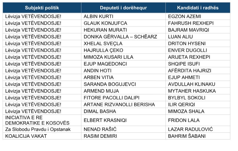 Më poshtë e gjeni listën e plotë të kandidatëve të dorëhequr dhe kandidatëve të radhës teksa tashmë mbetet procedimi i mandateve të tyre sipas procedurave ligjore në fuqi.