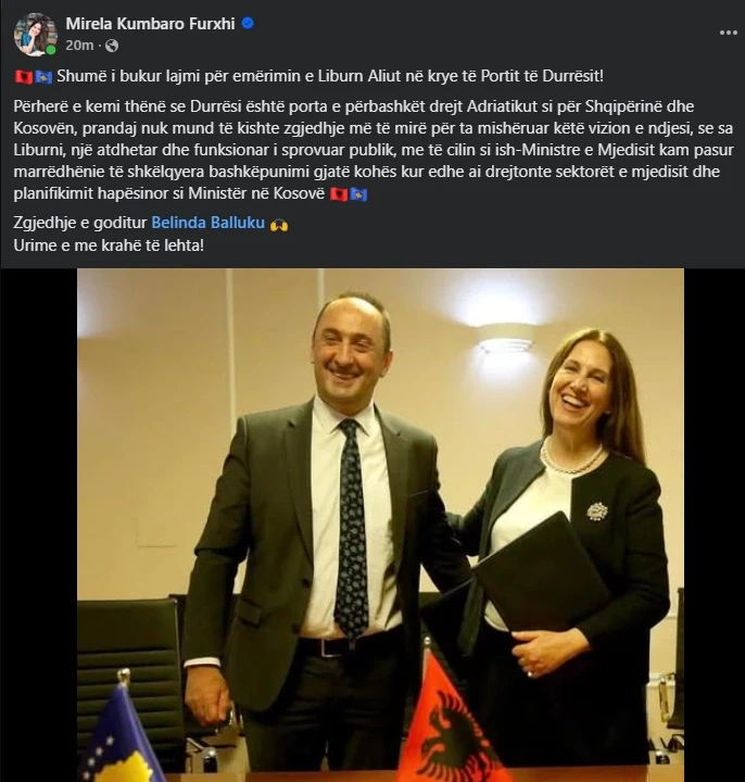 Ministrja e Arsimit e Shqipërisë, Mirela Kumbaro, ka hequr postimin nga Facebooku ku kishte uruar Liburn Aliun për emërimin në postin e drejtorit të Portit të Durrësit.