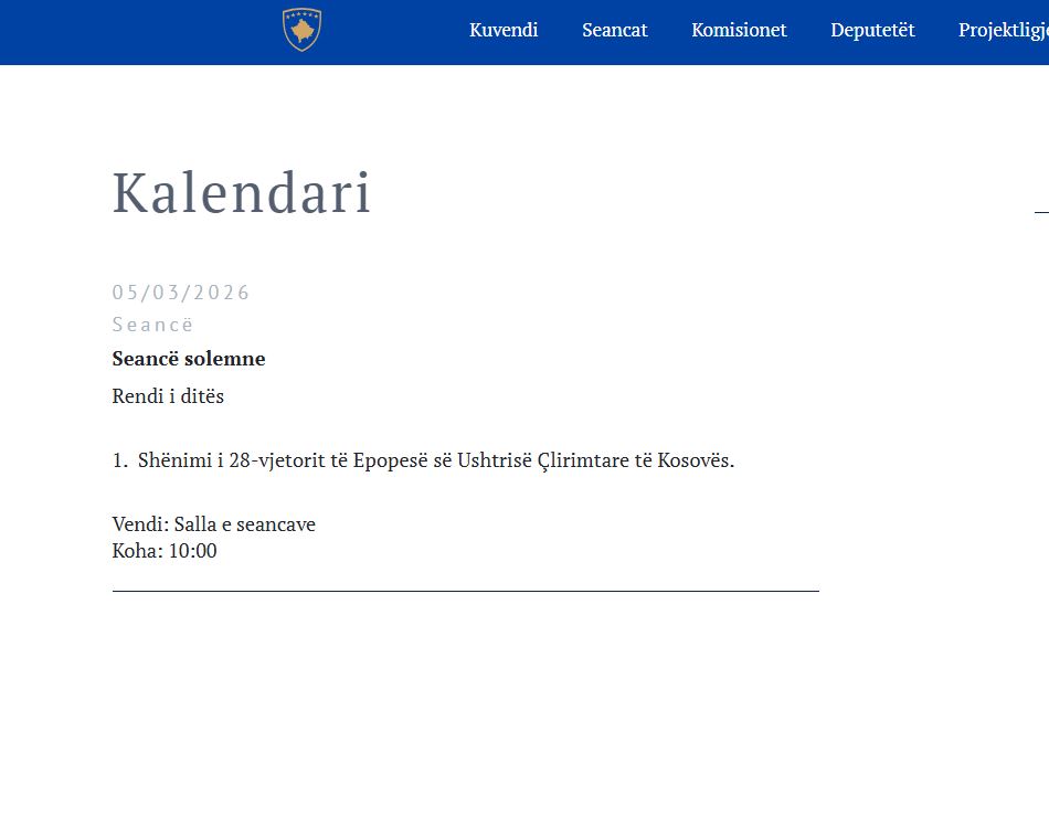 Sipas njoftimi në faqen zyrtare të Kuvendit, kjo seancë solemne do të mbahet në nderim të 28-vjetorit të Epopesë së Ushtrisë Çlirimtare të Kosovës, njofton Dukagjini.