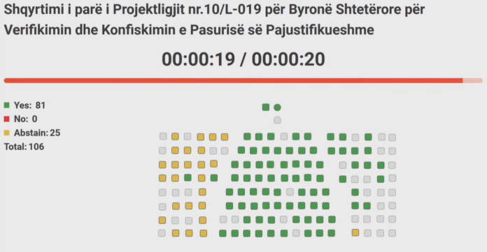 Projektligji kaloi me 81 vota për, asnjë kundër dhe 25 abstenime, duke kaluar kështu fazën e parë të procedurës legjislative.