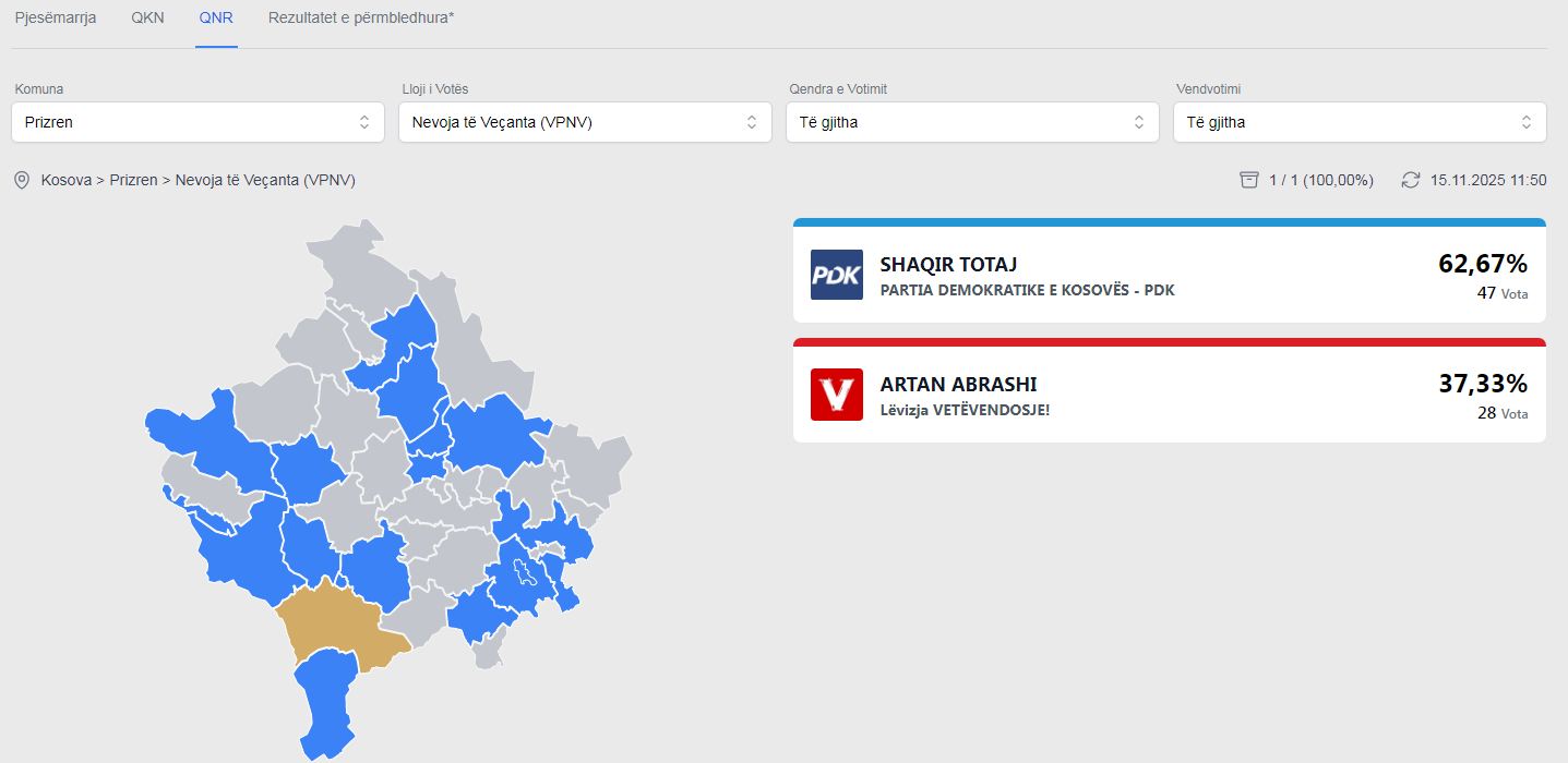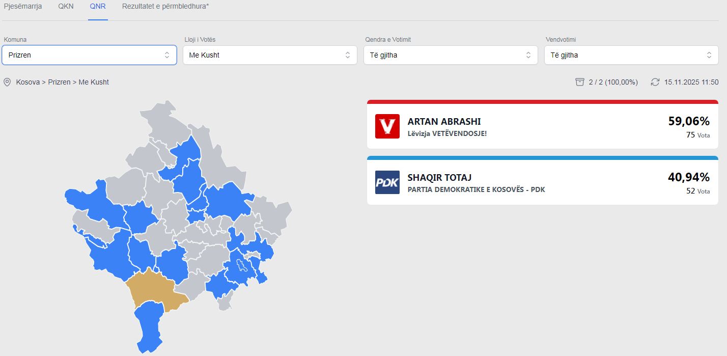 Sipas njoftimit të KQZ-së, kandidati i Lëvizjes Vetëvendosje, Artan Abrashi, del i pari në numërimin e votave me kusht pasi i ka siguruar 59.06% të tyre ose 75 vota derisa kandidati i Partisë Demokratike të Kosovës, Shaqir Totaj, mori 40.94% të votave ose 52 vota, njofton Dukagjini.