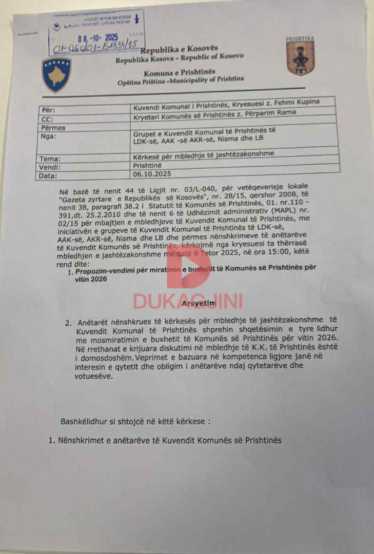 Kryesuesit të Kuvendit Komunal të Prishtinës, Fehmi Kupina, i është kërkuar nga grupet e LDK-së, AAK-së, AKR-së, Nismës dhe LB të thërrasë një mbledhje të jashtëzakonshme të enjten në ora 15:00 për shqyrtimin dhe miratimin e buxhetit të Komunës për vitin 2026.
