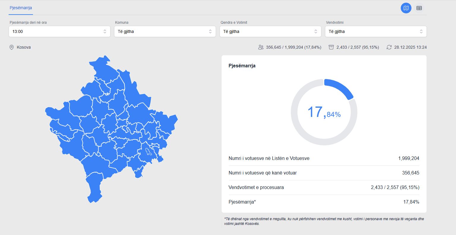 356 mijë e 645 persona ose 17,84 përqind kanë shfrytëzuar të drejtën e votës deri tani në zgjedhjet e parakohshme parlamentare që po mbahen këtë të diel.