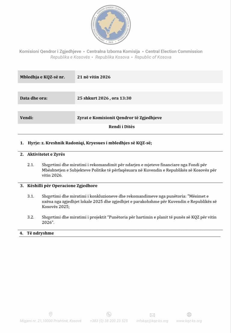 Komisioni Qendror i Zgjedhjeve do të zhvillojë sot mbledhjen e radhës, ku ndër pikat kryesore të rendit të ditës është shqyrtimi dhe miratimi i rekomandimit për shpërndarjen e mjeteve nga Fondi për Mbështetjen e Subjekteve Politike të përfaqësuara në Kuvendin e Republikës së Kosovës për vitin 2026.