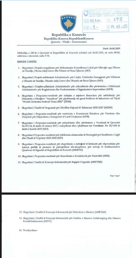 Sot [e mërkurë], kryeministri në detyrë, Albin Kurti do të zhvillojë takimin e radhës qeveritar me ministrat në detyrë. Kjo mbledhje e qeverisë do të fillojë nga ora 09;00. Dhe janë 14 pika ku do të shqyrtojnë së bashku, dhe shumica janë propozime të Ministrisë së Drejtësisë