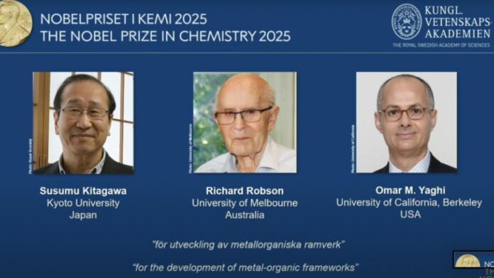Akademia Mbretërore Suedeze e Shkencave ka vendosur t’u japë Çmimin Nobel në Kimi për vitin 2025 Susumu Kitagawa, Richard Robson dhe Omar M. Yagi për zhvillimin e strukturave metalo-organike.