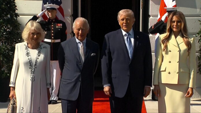 Jashtë Shtëpisë së Bardhë ishin vendosur flamuj britanikë, ndërsa presidenti Donald Trump dhe Zonja e Parë Melania Trump pritën çiftin mbretëror me shtrëngime duarsh.