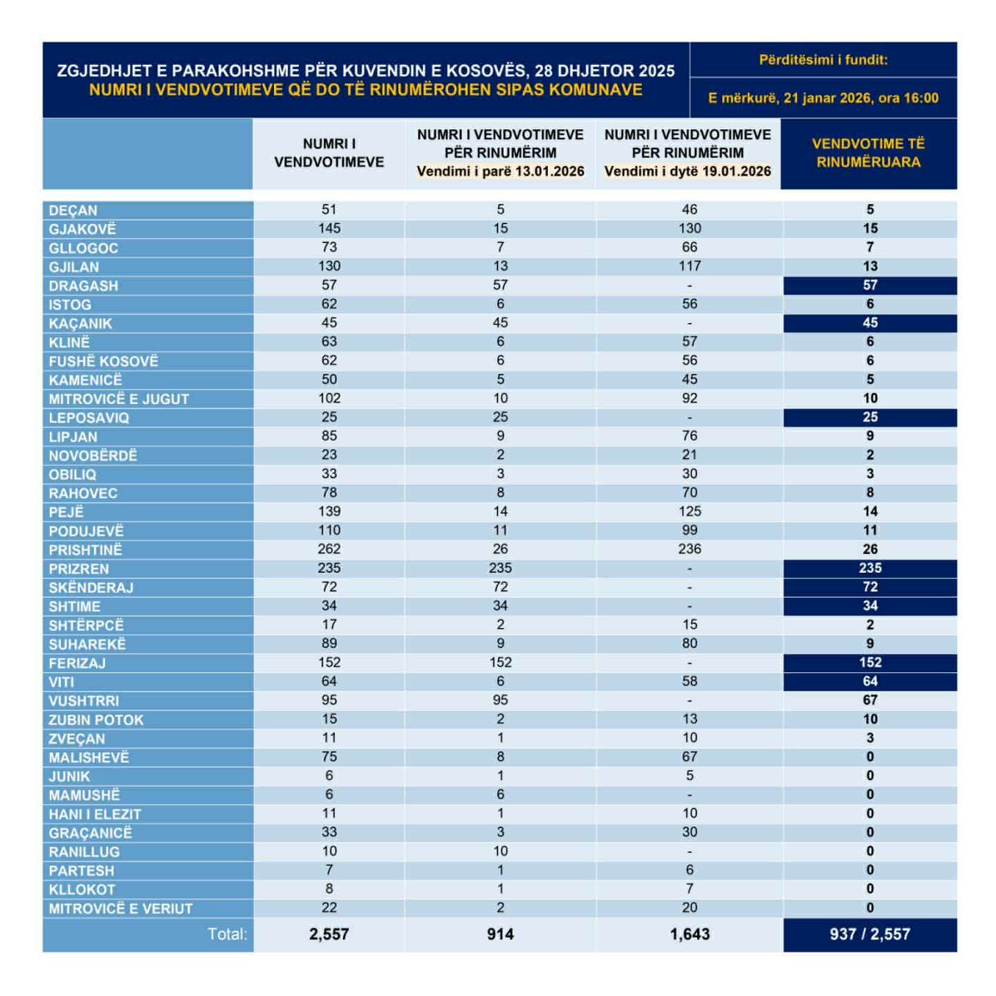 Sipas të dhënave zyrtare, nga fillimi i procesit të rinumërimit, më 13 janar 2026 në ora 18:00, e deri më 21 janar 2026 në ora 16:00, janë rinumëruar gjithsej 937 nga 2,557 vendvotime të planifikuara për këtë proces.