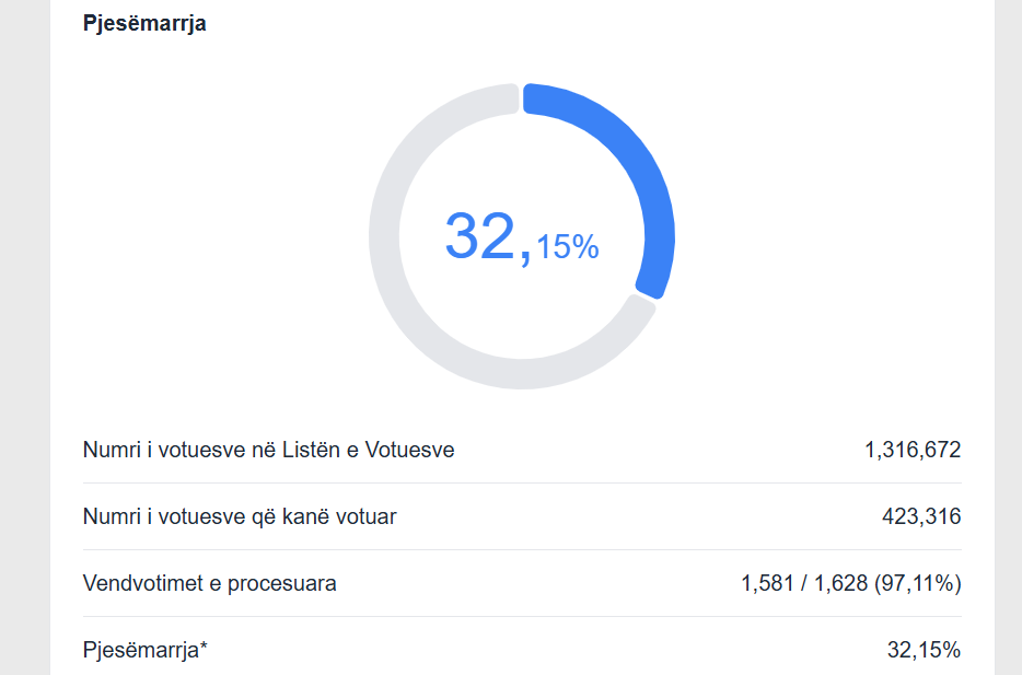Nga 1,628 vendvotime, 1,581 janë përpunuar ose 97.11% e tyre, njofton Komisioni Qendror i Zgjedhjeve.