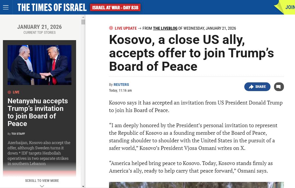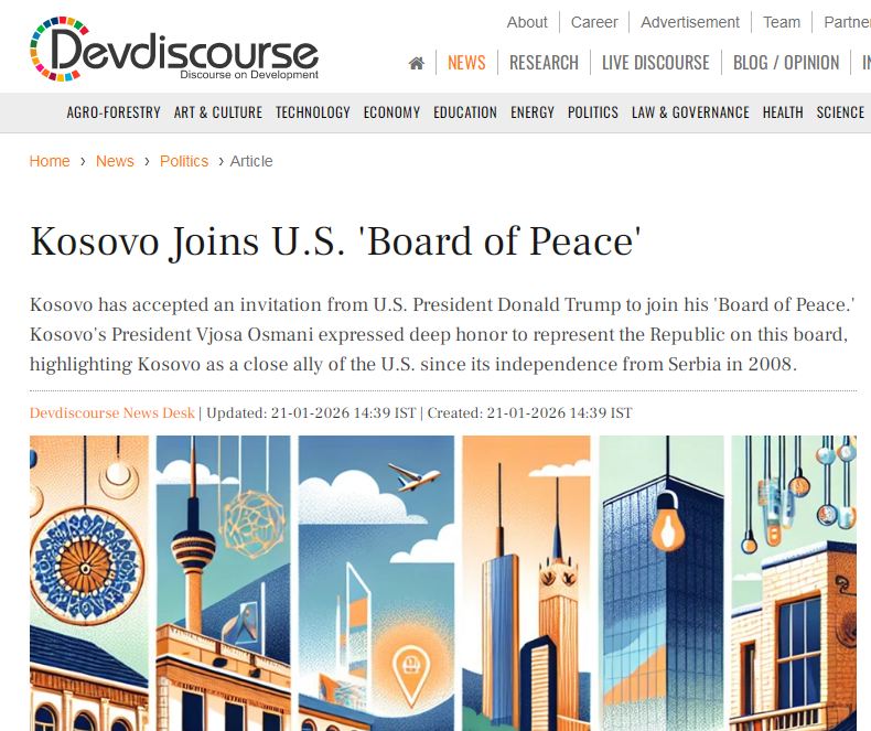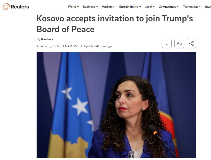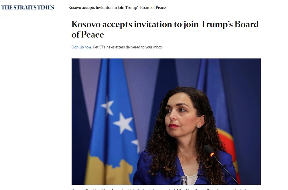 Mediat ndërkombëtare i kanë kushtuar një artikull të veçantë ftesës që presidentja e vendit, Vjosa Osmani, ka pranuar nga presidenti amerikan, Donald Trump, për t’u bërë pjesë e Bordit të Paqes, një iniciativë e re kjo e udhëhequr nga SHBA-të për adresimin e çështjeve globale të sigurisë dhe paqes.