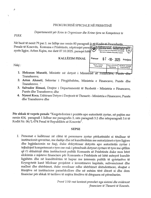 “Personat e kallëzuar në cilësi të personave zyrtar përkatësisht si titulluar të institucionit qeveritar, me dashje dhe në kundërshtim me autorizimet e tyre ligjore dhe legjislacionin ne fuqi, duke shfrytëzuar detyrën apo autoritetin zyrtar i tejkalojnë kompetencat e tyre ose nuk i përmbush detyrat zyrtare të tyre me qëllim që t’i shkaktojë dëm institucionit publik Komunës së Prishtinës duke mos bërë alokimin e mjeteve financiare për Komunën e Prishtinës në këtë mënyrë kundërligjshëm dhe në kundërshtim të hapur me interesin publik të qytetarëve të Kryeqytetit kanë bllokuar projektet e investimeve kapitale, subvencionet dhe mallrat dhe shërbimet, duke rrezikuar edhe shërbimet shëndetësore, shujtat e fëmijëve në institucione parashkollore dhe në mësim tërë ditorë si dhe dem financiar për shkak të tarifave të mijëra lëndëve të dërguara në përmbarim”, thuhet në kallëzim.