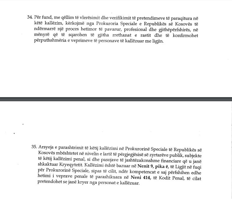 “Për fund, me qëllim të vlerësimit dhe verifikimit të pretendimeve të paraqitura në këtë kallëzim, kërkojmë nga Prokuroria Speciale e Republikës së Kosovës të ndërmarrë një proces hetimor të pavarur, profesional dhe gjithëpërfshirës, në mënyrë që të sqarohen të gjitha rrethanat e rastit dhe të konfirmohet përputhshmëria e veprimeve të personave të kallëzuar me ligjin”.