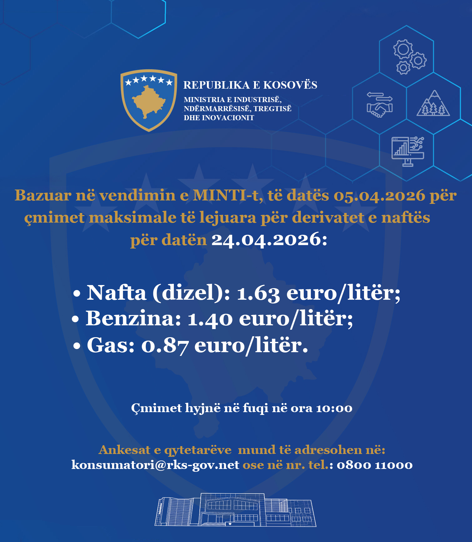 Ministria e Industrisë, Ndërmarrësisë, Tregtisë dhe Inovacionit ka publikuar çmimet maksimale të lejuara për shitjen e derivateve të naftës për datën 24 prill.