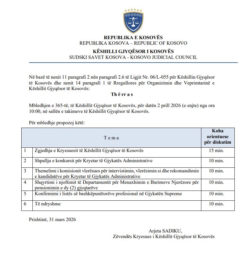 Në këtë mbledhje parashihej të bëhej edhe shpallja e konkursit për Kryetar të Gjykatës Administrative.