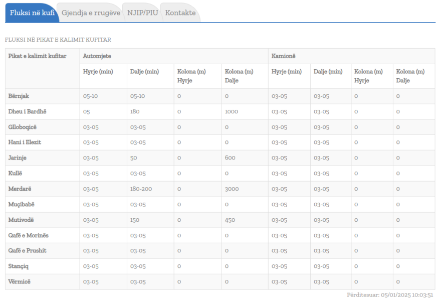Sipas përditësimit të fundit, të bërë në orën 10 e 25 minuta, pritje deri në 3 ka te Dheu i Bardhë, kurse në oikat tjera pritjet janë të vogla. Kurse në Mutivodë pritjet janë 2 orë e 30 minuta.