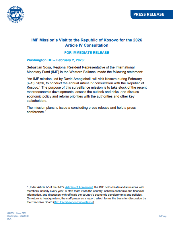 Përfaqësuesi Rajonal Rezident i Fondit Monetar Ndërkombëtar (FMN) për Ballkanin Perëndimor, Sebastian Sosa, ka njoftuar se një delegacion i FMN-së do të vizitojë Kosovën gjatë periudhës 3-13 shkurt, për të zhvilluar konsultimet vjetore në kuadër të Nenit IV me Republikën e Kosovës.