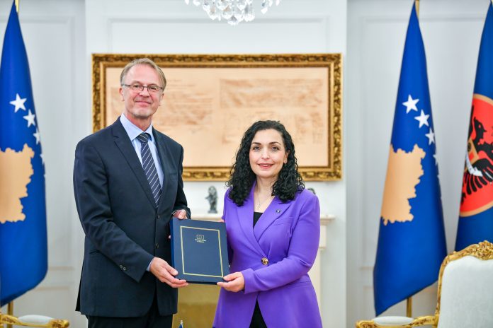 Presidentja e Republikës së Kosovës, Vjosa Osmani, priti sot në takim Shefin e Zyrës së Bashkimit Evropian në Kosovë, Ambasadorin Aivo Orav, i cili i dorëzoi “Raportin për Kosovën 2024” nga Komisioni Evropian.