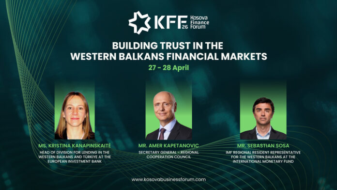 Kosova Finance Forum 2026 do të mbledhë më 27 dhe 28 prill në Prishtinë përfaqësues të institucioneve financiare ndërkombëtare, politikëbërës dhe ekspertë të ekonomisë për të diskutuar zhvillimin e tregjeve financiare dhe mundësitë për mobilizimin e kapitalit në Ballkanin Perëndimor.